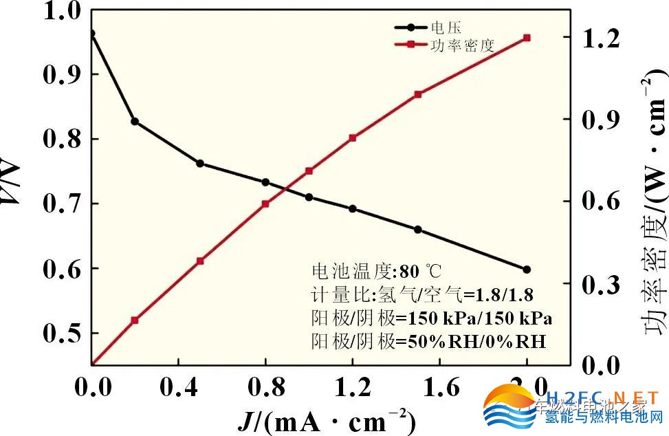 采用自制燃料電池單電池評價設(shè)備測試極化曲線,測試條件:電池溫度80 ℃,H2/空氣過量系數(shù)1.8/1.8,H2/空氣相對濕度50%RH/0%RH,反應(yīng)氣入口壓力150 kPa。