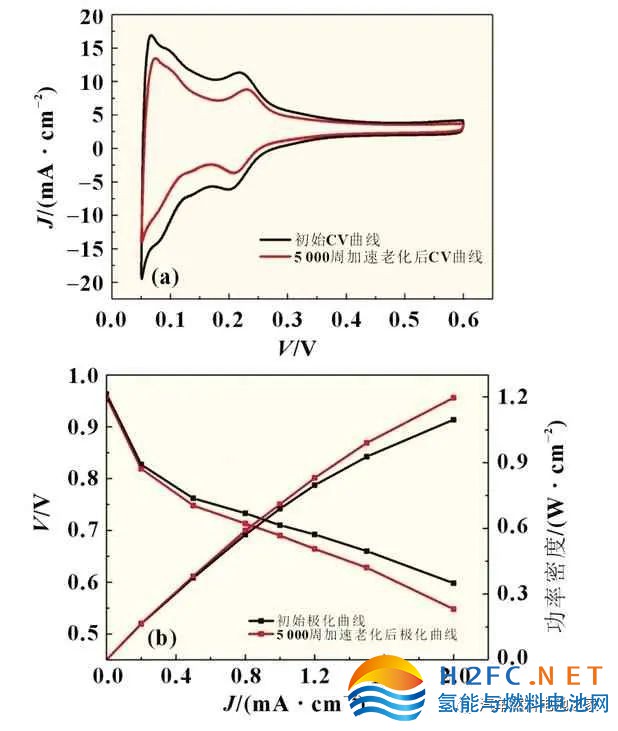 加速老化測試分為載體老化測試和催化劑老化測試。載體老化采用1.0——1.5 V 三角波循環(huán)掃描,掃描速率0.5 V/s,循環(huán)次數(shù)為5 000 周。催化劑老化采用0.6 和0.95 V 方波循環(huán),每個電位停留3 s,循環(huán)次數(shù)為30 000 周。加速老化測試前后,重復(fù)進(jìn)行極化曲線和CV 測試。