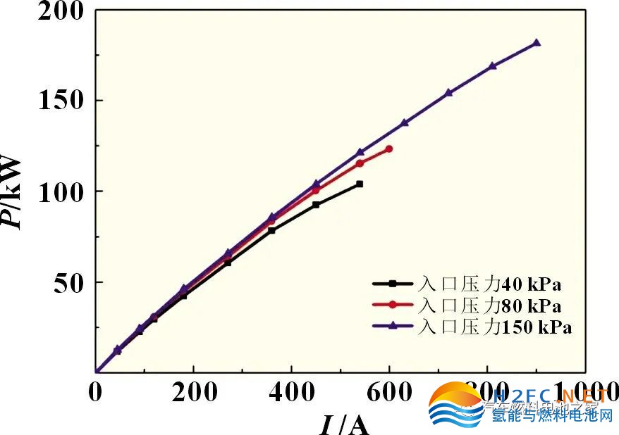 電堆運(yùn)行過程中所需的空氣壓力條件對于空壓機(jī)的選型會產(chǎn)生較大影響,圖7 為STKCI-330B 電堆在陰極入口40、80 以及150 kPa 操作壓力下的性能曲線。