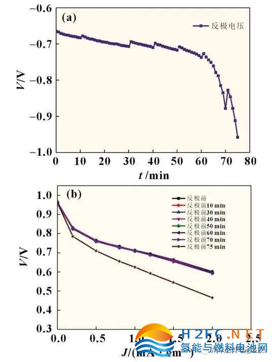 圖6 (a)MEA 反極測試過程中電壓變化和(b)MEA反極前后極化曲線對比