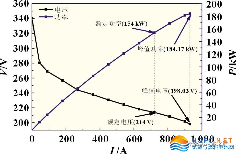 從測試結(jié)果可以看出,電堆在930 A 電流條件下,輸出功率可達(dá)184.17 kW,功率密度可達(dá)3.56 kW/L。