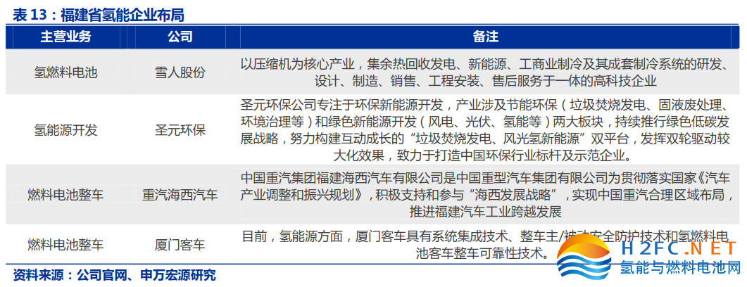 福建省在下游整車領(lǐng)域具有優(yōu)勢,但在上游制氫與中游燃料電池系統(tǒng)領(lǐng)域還需補強。目前,福建省期望以福州氫能產(chǎn)業(yè)基地等為核心打造制氫、儲氫、運氫、加氫全產(chǎn)業(yè)鏈,發(fā)揮廈門客車、雪人股份、圣元環(huán)保等重點企業(yè)作用,以壯大氫燃料電池客車、物流車(含冷鏈物流)、專用車等生產(chǎn)規(guī)模。