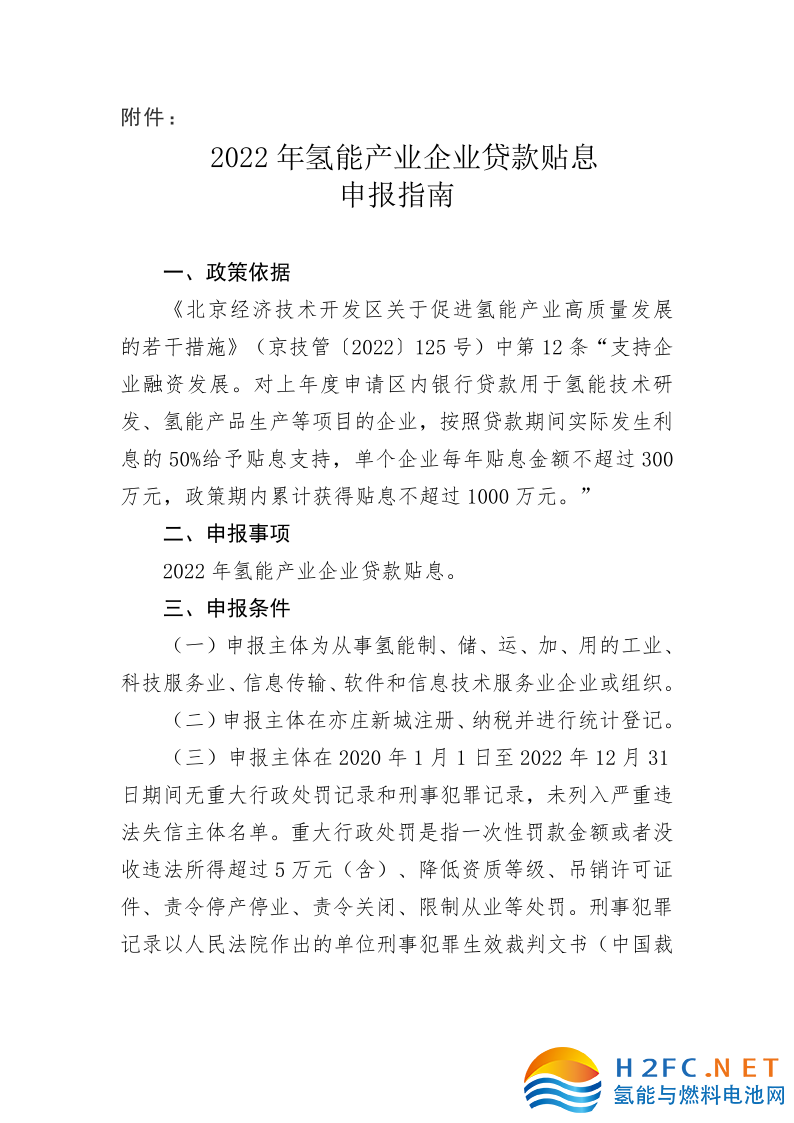 為貫徹落實《北京經濟技術開發區關于促進氫能產業高質量發展的若干措施》(京技管〔2022〕125號)的工作要求,現開展2022年氫能產業企業貸款貼息申報工作,通知如下: