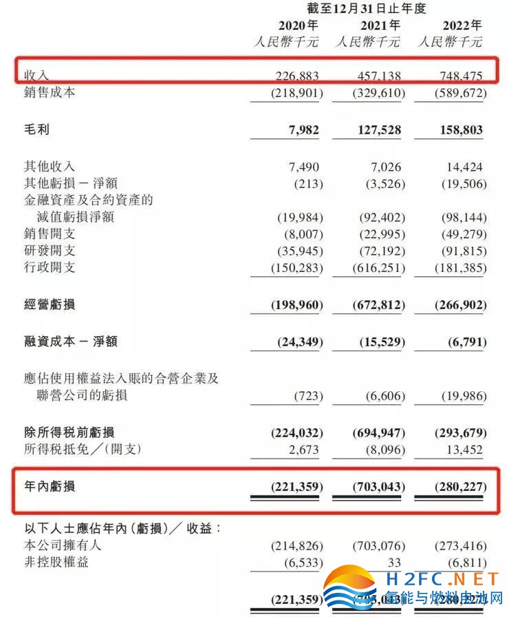 根據招股說明書,2020-2022年,國鴻氫能的收入分別為2.27億元、4.57億元、7.48億元,年內虧損分別為2.21億元、7.03億元、2.80億元。