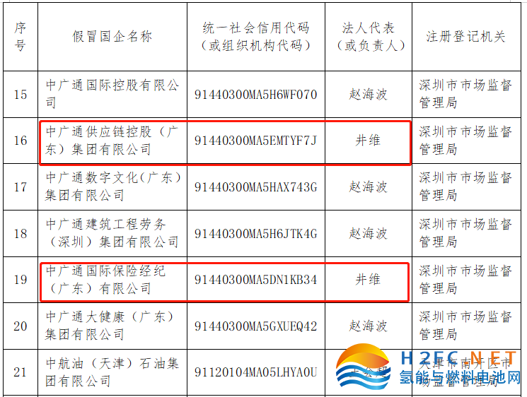 國資委“中央企業公告的假冒國企名單匯總(第二批)”名單中,可以清晰地看到,“中廣通”赫然在列,令人驚訝的是,竟然有六家以“中廣通”為開頭的公司出現在名單上,而且,“中廣通供應鏈控股(廣東)集團有限公司”和“中廣通國際保險經紀(廣東)有限公司”的法人代表姓名也都是井維。