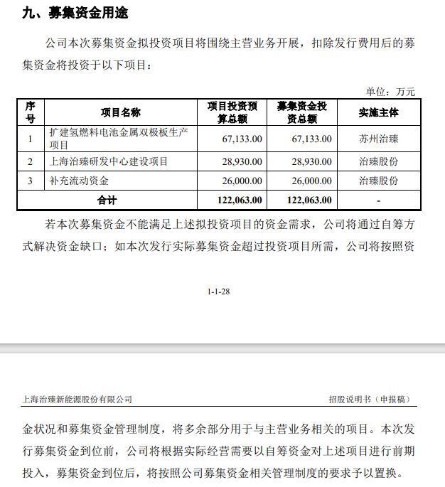 本次發行所募得資金計劃用于擴建金屬雙極板產線、研發中心建設和補充流動資金。