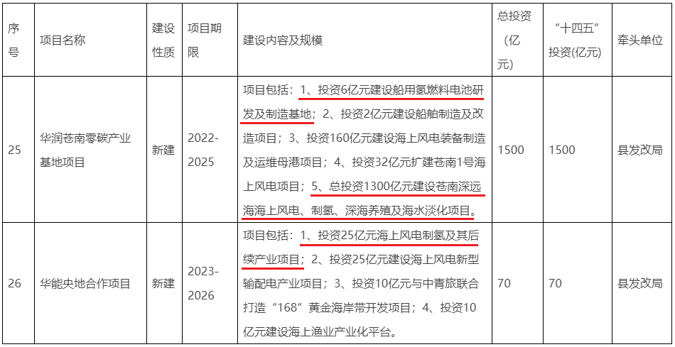 根據蒼南縣“十四五”科技重點支撐項目清單,華潤蒼南零碳產業基地項目總投資1500億元,其中,投資6億元建設船用氫燃料電池研發及制造基地;總投資1300億元建設蒼南深遠海海上風電、制氫、深海養殖及海水淡化項目。華能央地合作項目總投資70億元,其中,投資25億元海上風電制氫及其后續產業項目。