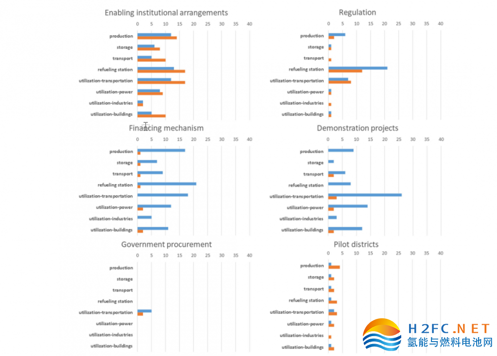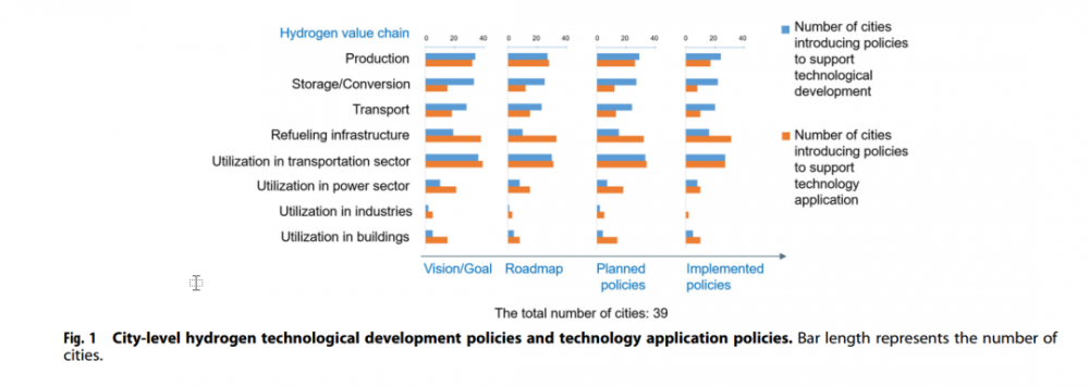 (4)如圖1所示,對(duì)技術(shù)發(fā)展的政策支持延伸到氫價(jià)值鏈的所有環(huán)節(jié),表明城市不僅是將氫應(yīng)用于基礎(chǔ)設(shè)施的運(yùn)營(yíng)單位,而且也是技術(shù)研發(fā)的直接支持者。