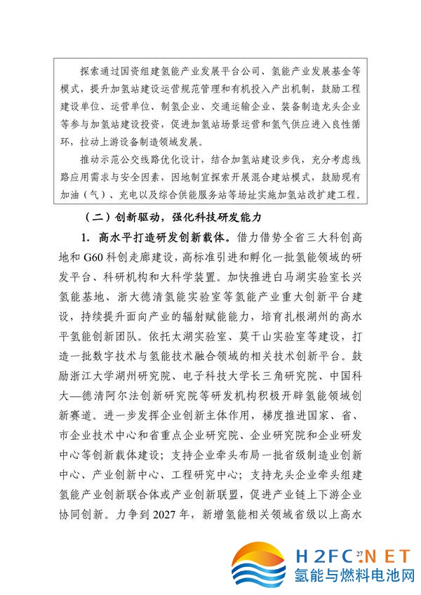 到2027年,培育和引進氫能產業相關領域企業50家以上,培育上市企業2家以上,發展初具規模;氫能及相關產業年產值突破100億元,形成具備湖州特色的產業鏈關鍵環節集聚;建成獨立加氫站和綜合供能服務站5座以上,打造具有示范協同效應的標志性氫能應用場景個以上;初步建成具有長三角區域影響力的“環太湖氫走廊”。