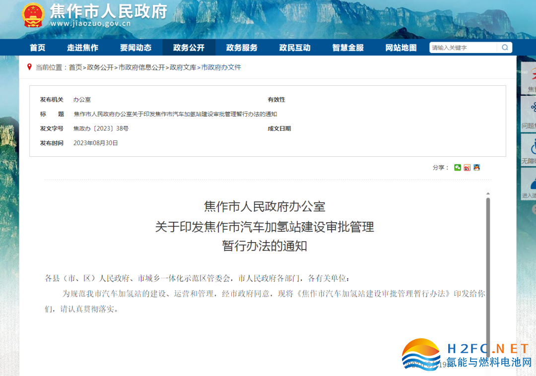 8月30日,河南焦作市人民政府印發(fā)《焦作市汽車加氫站建設(shè)審批管理暫行辦法》。