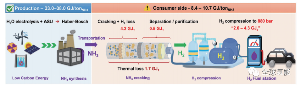 氨作為可行的氫儲(chǔ)能材料確實(shí)具有巨大潛力,但與液氫相比,使用氨作為氫載體的運(yùn)輸體系在整體的電-燃料-電(PFP)效率方面沒有明顯優(yōu)勢(shì)。另外,裂解過程對(duì)大量能量的需求限制了其未來的應(yīng)用。此外,凈化和壓縮后的氫氣用于供應(yīng)燃料電池汽車的財(cái)務(wù)和能源成本都很高,其中投入的電能和熱能成本難以通過其他方面的收益回收。