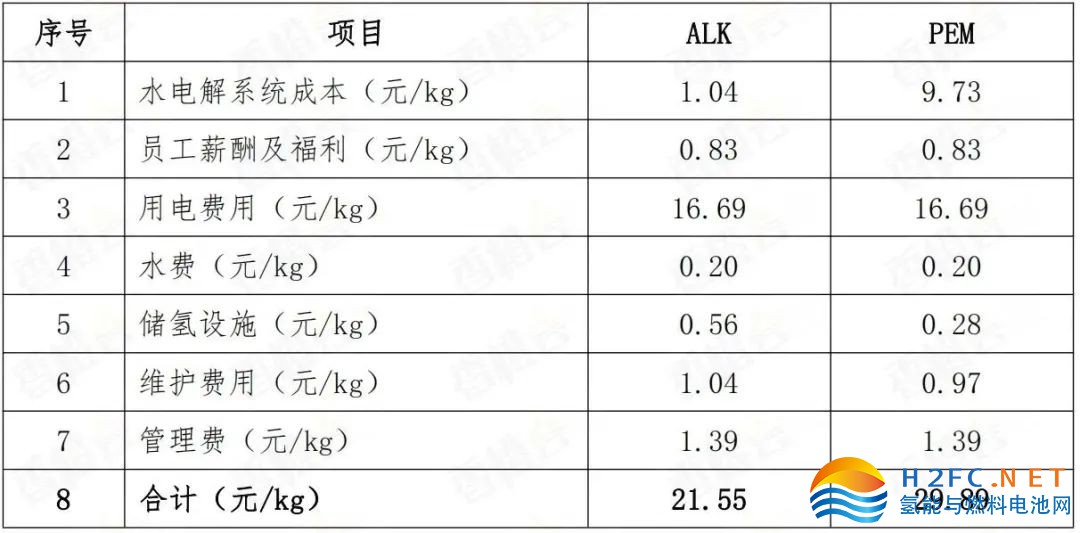 表 2:ALK和PEM水電解制氫成本
