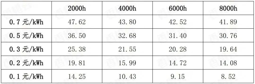 4、在ALK制氫系統(tǒng)中,當電價低于0.1元/kWh時,制氫成本在15元/kg以內;若電價低于0.2元/kWh且年運營時間達到4000小時以上時,制氫成本同樣在15元/kg以內。而當年運營時間達到8000小時時,制氫成本則可降低至8.52元/kg。