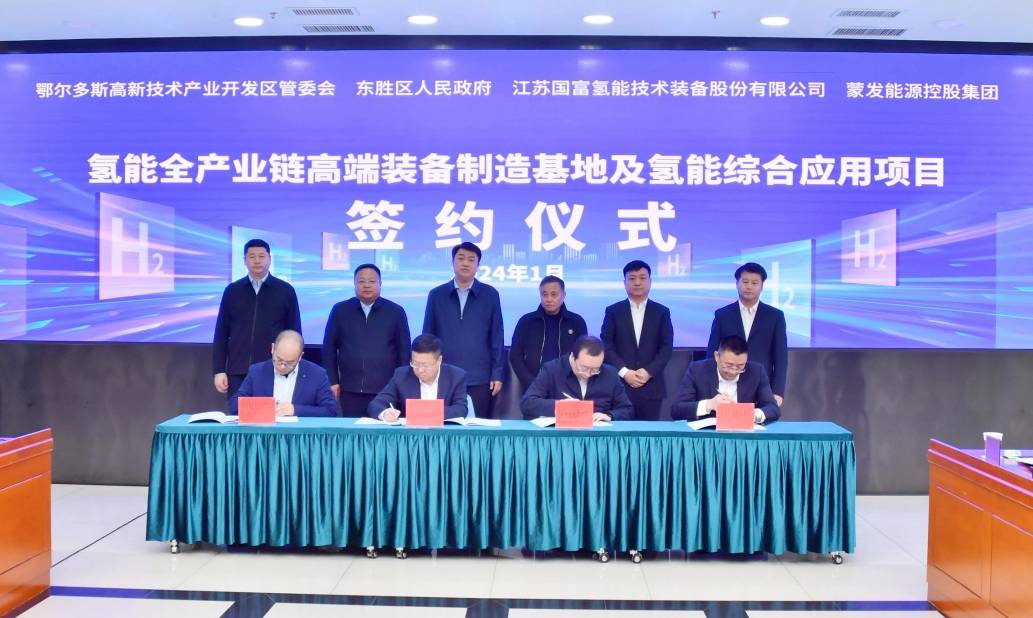 1月29日,鄂爾多斯高新技術(shù)產(chǎn)業(yè)開發(fā)區(qū)管委會(huì)、東勝區(qū)人民政府與江蘇國富氫能技術(shù)裝備股份有限公司、蒙發(fā)能源控股集團(tuán)成功簽約氫能全產(chǎn)業(yè)鏈高端裝備制造基地及氫能綜合應(yīng)用項(xiàng)目。