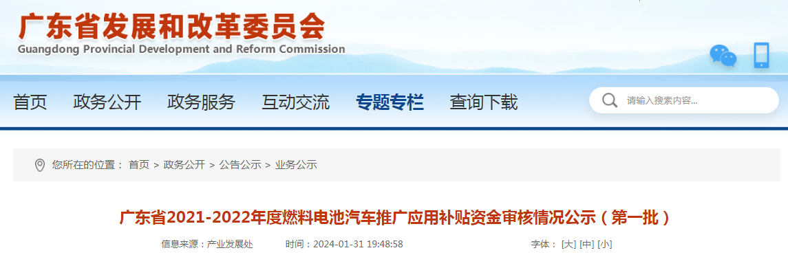 1月31日,廣東省發改委發布《廣東省2021-2022年度燃料電池汽車推廣應用補貼資金審核情況公示(第一批)》。