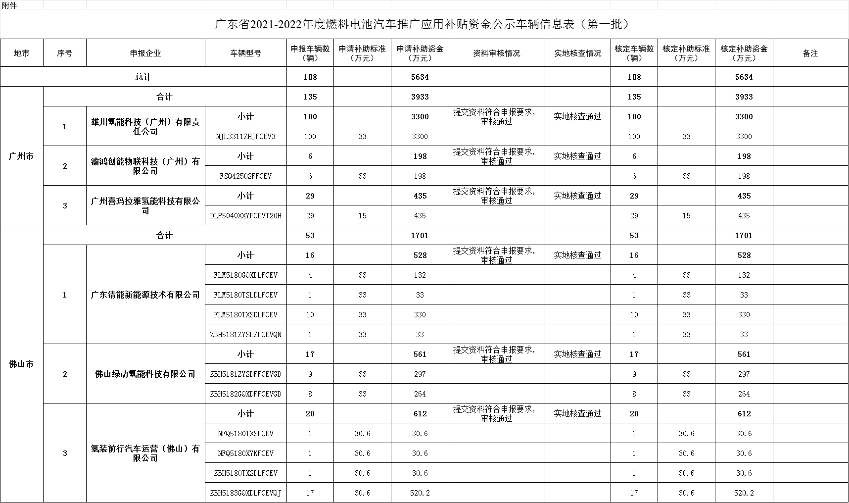 廣東省2021-2022年度燃料電池汽車推廣應用補貼資金審核情況公示(第一批)
