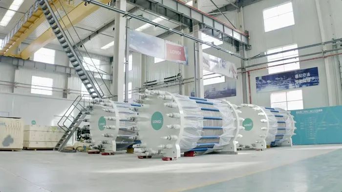 2021年3月,隆基氫能在西安注冊成立,同年4月在無錫建立工廠,10月完成了首臺1000標方/小時堿性電解槽下線,并在成立當年實現了500MW產能。