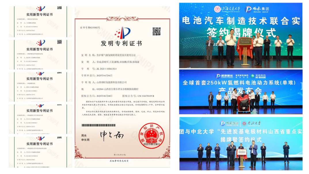多年來,得益于各級黨委政府及各部門的鼓勵和支持,山西鵬飛集團氫能創新成果顯著:與上海交通大學共建燃料電池汽車先進制造技術聯合實驗室,共同申報汽車動力與智能控制國家工程研究中心;與中北大學共建先進炭基電極材料山西省重點實驗室;山西省氫能成果轉化基地、山西省氫能中試基地獲得省科技廳批復;自主研發的全球首套250kW氫燃料發動機(單堆)在孝義發布;“焦爐煤氣制氫吸附塔裝置及其使用方法”獲得國家知識產權局頒發的《發明專利證書》,有5種設備、裝置、系統獲得國家實用新型專利證書;與太原理工大學黃慶學院士課題組共同開展Ⅳ型儲氫瓶的研發制造;在呂梁市成立首家全國博士后科研工作站;《焦爐煤氣制高純氫轉化工藝安全技術要求》《焦爐煤氣制高純氫單位產品能耗限額及計算方法》兩項團體標準在全國團體標準信息平臺正式發布,填補了國內在焦爐煤氣制高純氫領域標準化的空白;與省內外行業領軍企業圍繞技術創新、產業協同、市場拓展等深化合作,實現“一企帶一鏈、一鏈成一片”,累累碩果,充分彰顯了該集團在氫能領域的實力和潛力。