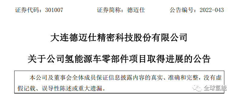 公告顯示,德邁仕已和博世(Bosch)、緯湃科技(Vitesco Technologies)、未勢能源客戶在氫能源車零部件方面達成合作關系,體現了客戶對于公司研發實力、產品質量及生產能力的認可,上述項目具體銷售數量及金額將根據最終訂單為準,預計對公司本年度的營業收入及利潤水平無重大影響,但有利于增強公司在汽車精密零部件領域的綜合競爭實力。