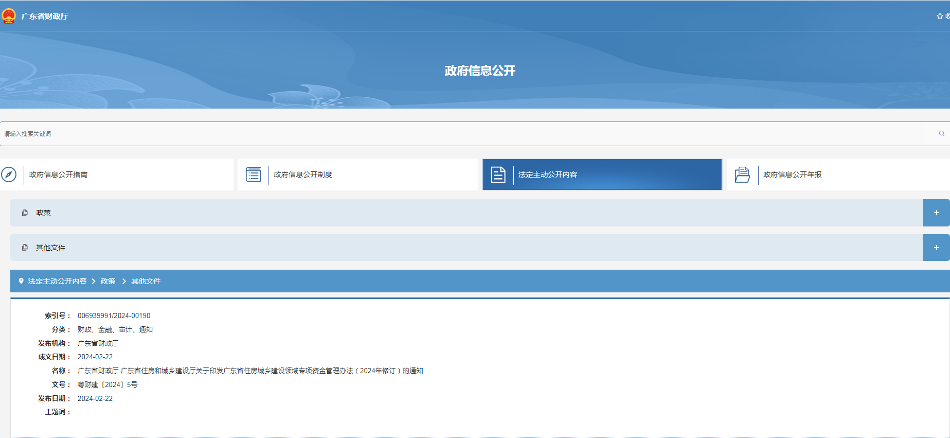 2月22日,廣東省財政廳、省住房城鄉建設廳制訂了《廣東省住房和城鄉建設廳區域協調發展戰略(住房和城鄉建設)專項資金管理辦法(2024年修訂)》和《廣東省住房和城鄉建設廳主管綠美廣東生態建設專項資金管理辦法(2024年修訂)》。