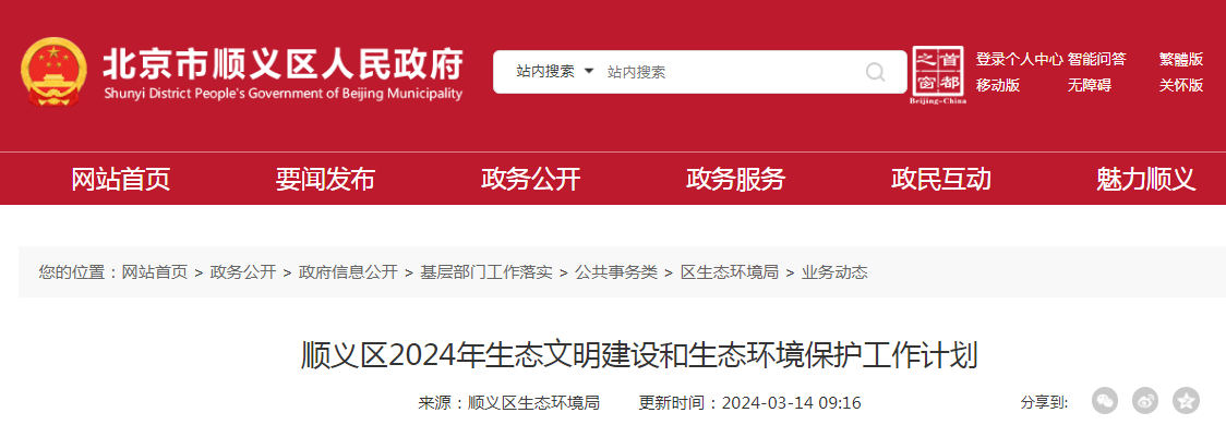 2024年3月14日,北京市順義區人民政府發布了順義區2024年生態文明建設和生態環境保護工作計劃。
