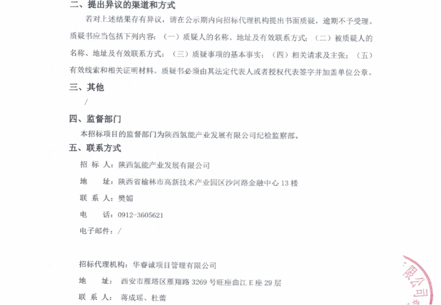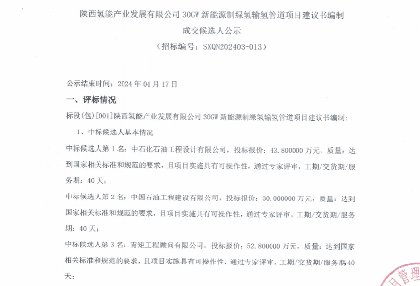 2024年4月15日,陜西氫能產業發展有限公司30GW新能源制綠氫輸氫管道項目建議書編制成交候選人公示。