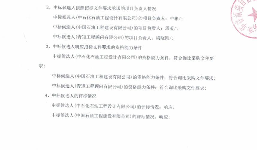 據悉,該公告內容明確指出,中標候選人第1名為中石化石油工程設計有限公司,投標報價:43.800000萬元;中標候選人第2名為中國石油工程建設有限公司,投標報價:30.000000萬元;中標候選人第3名為青矩工程顧問有限公司,投標價:52.800000萬元。