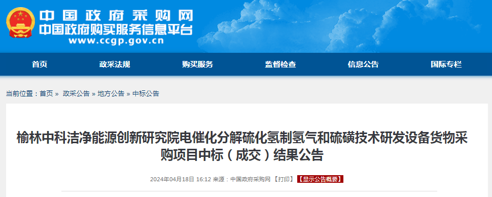 近日,榆林中科潔凈能源創新研究院電催化分解硫化氫制氫氣和硫磺技術研發設備貨物采購項目中標(成交)結果公告公布。