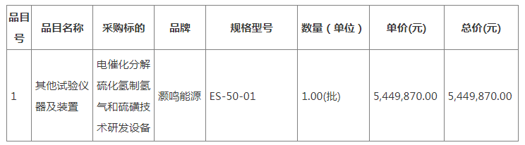 據悉,該公告內容明確指出,項目名稱為電催化分解硫化氫制氫氣和硫磺技術研發設備貨物采購項目,供應商名稱為灝鳴能源科技(大連)有限公司,中標(成交)金額為5,449,870.00元,采購需求為1批電催化分解硫化氫制氫氣和硫磺技術研發設備。