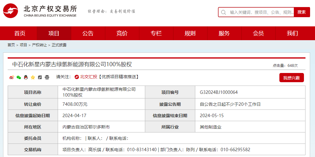 近日,北京產權交易所發布的相關公告顯示,中石化新星內蒙古綠氫新能源有限公司100%轉讓股權,其中包含氫產能3萬噸/年的項目。