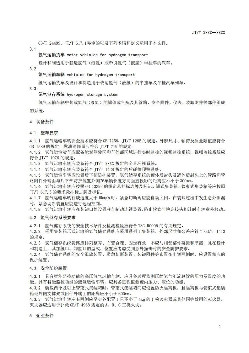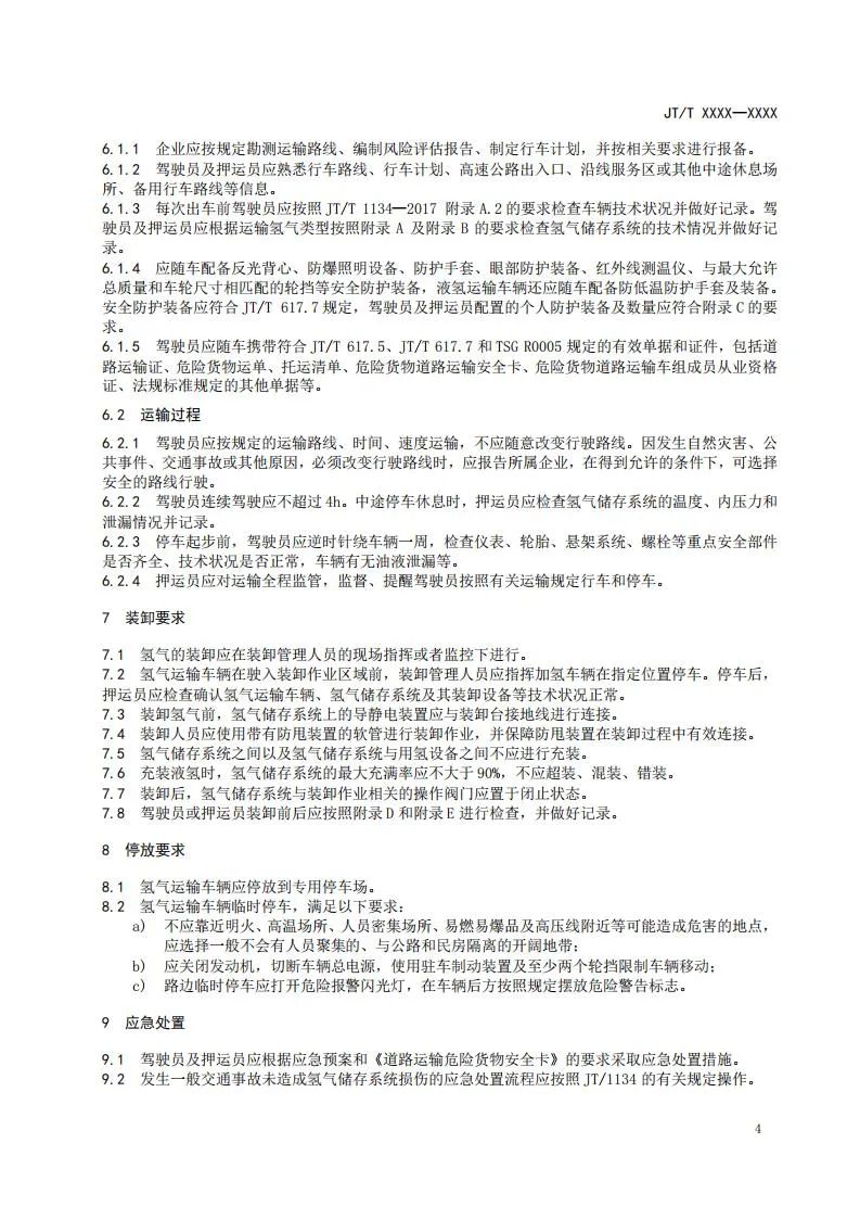 該文件規定了氫氣(含液氫)道路運輸的裝備條件、企業條件、運輸要求、裝卸安全、停放要求及應急處置等要求;適用于采用長管拖車、罐車、管束式集裝箱、罐式集裝箱等車輛或裝備的氫氣(含液氫)道路運輸;不適用于采用盛裝氫氣的散裝氣瓶、集束裝置(臥式設計的集束裝置除外)和集裝籃,以及固態氫等的道路運輸。