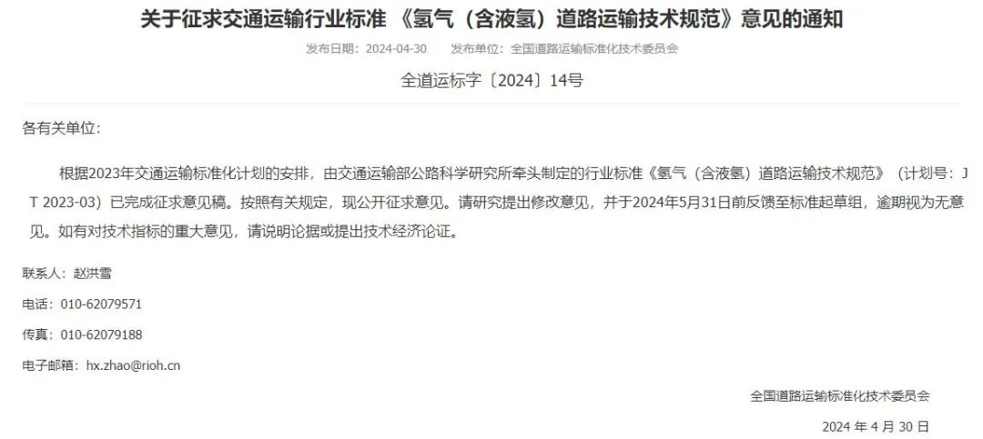 2023年8月,交通運輸部在《關于下達2023年交通運輸標準化計劃(第一批)的通知》中提出,制定《氫氣(含液氫)道路運輸技術規范》。文件指出,項目完成周期原則上不得超過18個月。