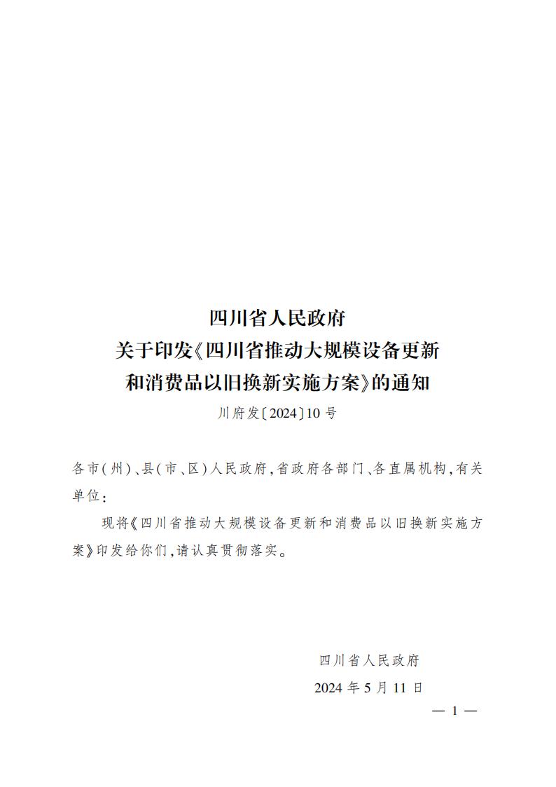 四川省人民政府關(guān)于印發(fā)《四川省推動大規(guī)模設(shè)備更新和消費品以舊換新實施方案》的通知