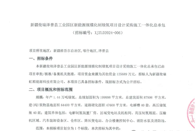 5月14日,新疆俊瑞澤普縣工業(yè)園區(qū)新能源規(guī)模化制綠氫項目設(shè)計采購施工一體化總承包公開招標(biāo):