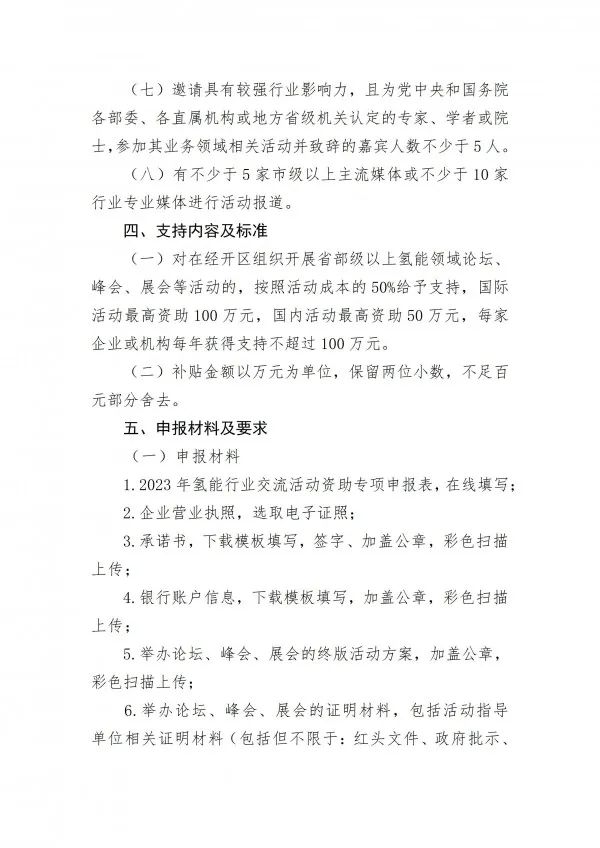 2、對(duì)在經(jīng)開(kāi)區(qū)組織開(kāi)展省部級(jí)以上氫能領(lǐng)域論壇、峰會(huì)、展會(huì)等活動(dòng)的,按照活動(dòng)成本的50%給予支持,國(guó)際活動(dòng)最高資助100萬(wàn)元,國(guó)內(nèi)活動(dòng)最高資助50萬(wàn)元,每家企業(yè)或機(jī)構(gòu)每年獲得支持不超過(guò)100萬(wàn)元。