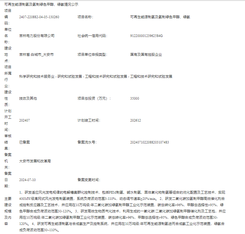 7月10日,吉林吉林電力股份有限公司可再生能源制氫及氫制綠色甲醇、綠氨項目完成備案。