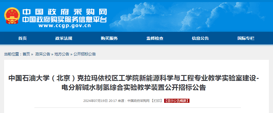 招標公告內容指出,中國石油大學(北京)克拉瑪依校區工學院新能源科學與工程專業教學實驗室建設-電分解堿水制氫綜合實驗教學裝置預算金額1200000元、最高限價1200000元。