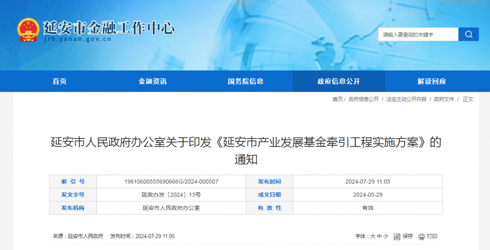 2024年7月29日,延安市人民政府辦公室發布關于印發《延安市產業發展基金牽引工程實施方案》的通知。