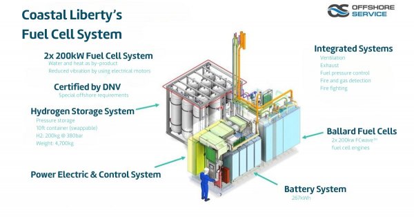 氫氣由庫克斯港陸上設施生產,經油罐式拖車運送到Coastal Liberty船上,并通過巴拉德的燃料電池轉化為電能。產生的電能可以儲存在電池中,為船上的電動機提供動力。這種零排放運輸的過渡代表著向可持續發展海上作業的轉型,同時也有助于減少該船對荷蘭海岸附近敏感的瓦登海地區的環境影響。