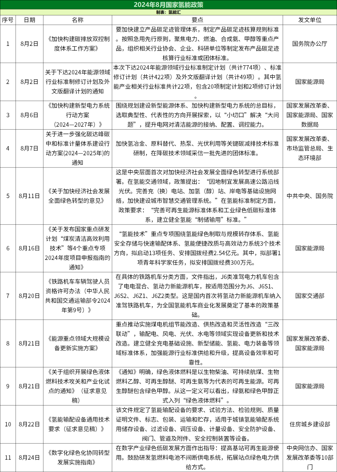 據氫能匯統計,2024年8月,我國發布了40條與氫能相關的政策,包括國家層面的11條,地方層面的29條。國家:氫能應用場景持續擴大氫能匯(微信公眾號:h2-2005)發現,今年8月,國家層面發布的政策中有11項涉及到氫能,這一數量是近些時間來的一個小“高峰”。