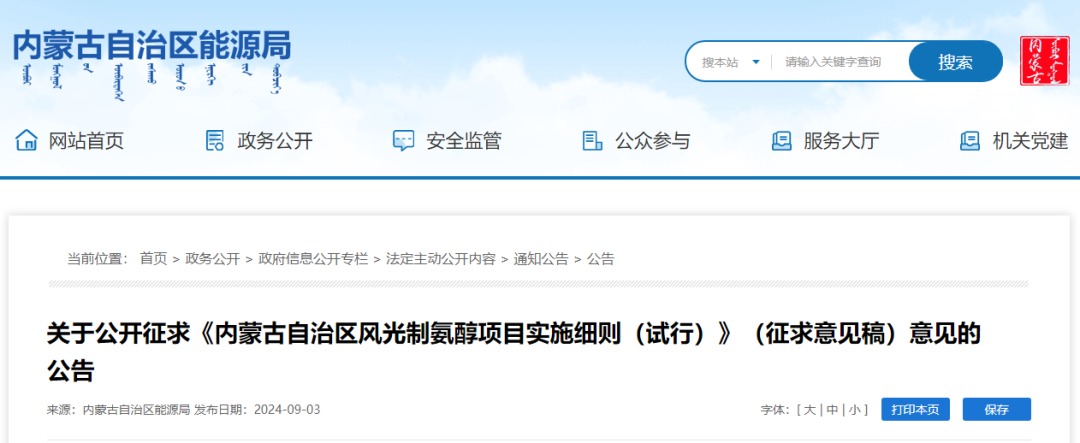 關于公開征求《內蒙古自治區風光制氨醇項目實施細則(試行)》(征求意見稿)意見的公告