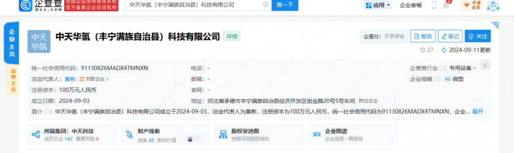 近日,中天華氫(豐寧滿族自治縣)科技有限公司成立,法定代表人為黃彬,注冊資本100萬元,經營范圍包含:氣體、液體分離及純凈設備制造;站用加氫及儲氫設施銷售;氣體壓縮機械制造;物聯網技術服務等。企查查股權穿透顯示,該公司由中天科技旗下中天華氫有限公司全資持股。