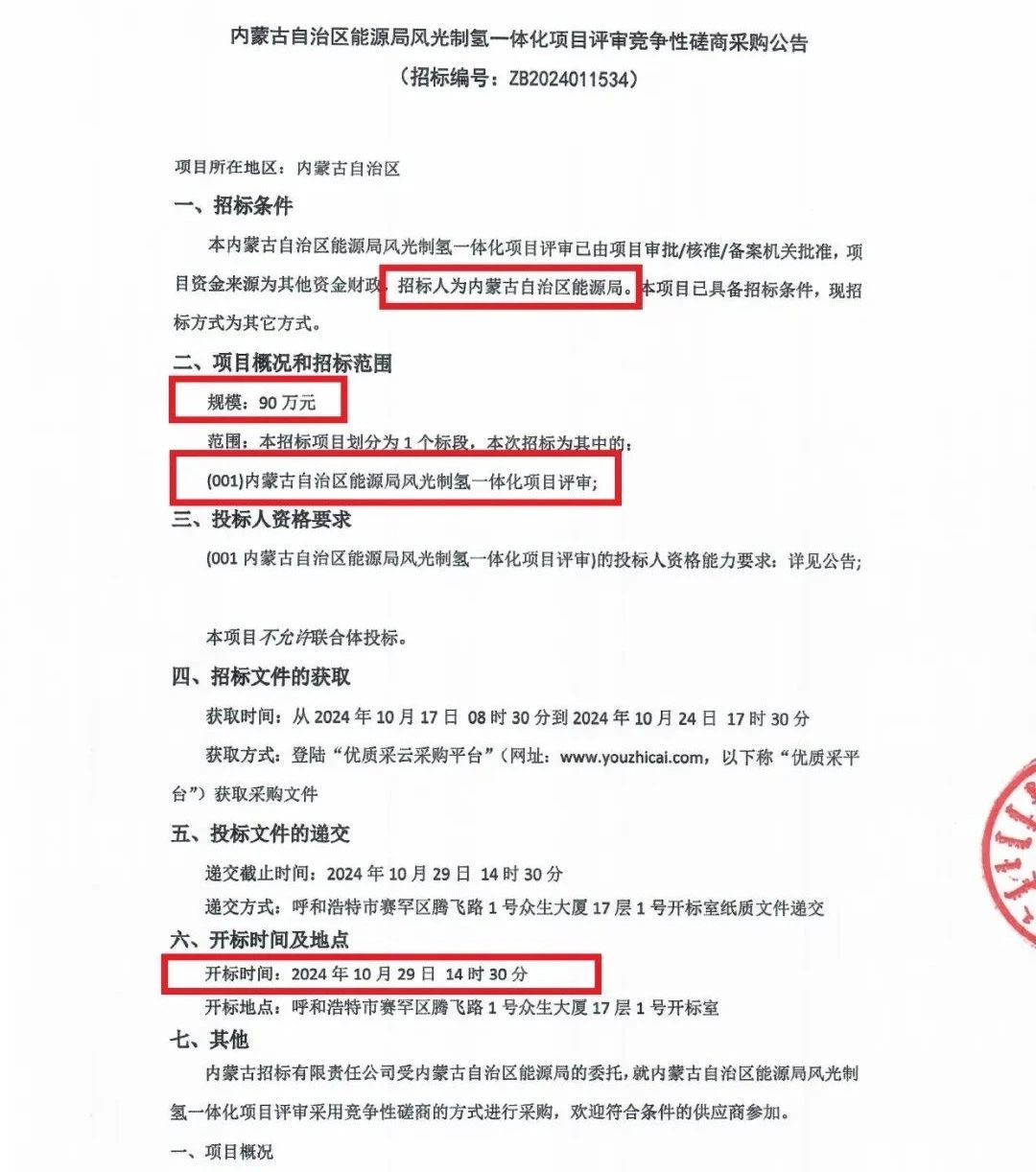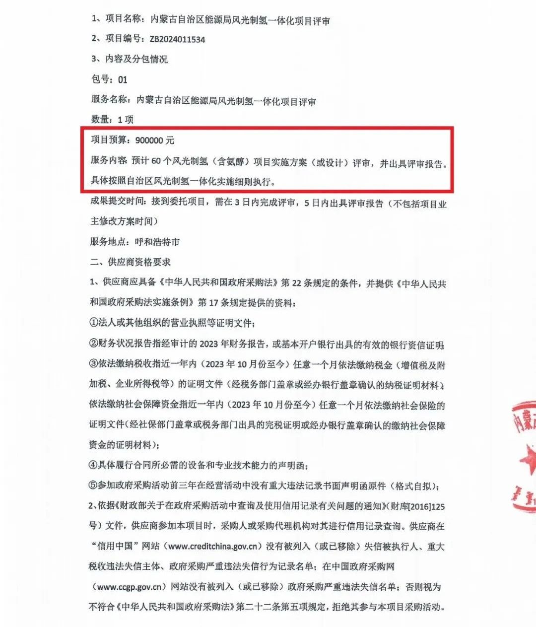 1、招標(biāo)人:內(nèi)蒙古自治區(qū)能源局。2、項(xiàng)目預(yù)算:90萬元。3、招標(biāo)范圍:預(yù)計(jì)60個風(fēng)光制氫(含氨醇)項(xiàng)目實(shí)施方案(或設(shè)計(jì))評審,并出