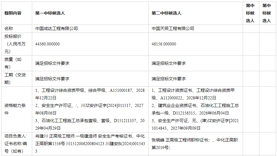 公告顯示,該項(xiàng)目第一、第二中標(biāo)候選人分別為中國(guó)成達(dá)工程有限公司、中國(guó)天辰工程有限公司,投標(biāo)報(bào)價(jià)分別為44360萬(wàn)元、46156萬(wàn)元。