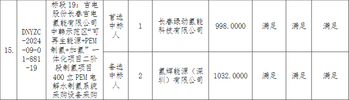 首選中標人為:長春綠動氫能科技有限公司,投標報價998萬元;備選中標人為:氫輝能源(深圳)有限公司,投標報價為1032萬元。
