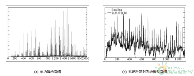 燃料電池系統中,氫氣通過噴射系統進入電池陰極參與反應,噴射系統通過支架安裝在汽車底盤,供氫管道通過卡扣與車身連接,由于噴射系統存在較為穩定的噴射,因此可能產生結構噪聲。葉勝望等對某款燃料電池汽車的氫燃料噴射噪聲進行了相關分析,對比車內噪聲頻譜與氫燃料噴射系統振動頻譜較為一致,如圖所示,確定噪聲是由氫燃料噴射系統產生,經研究認為該噪聲問題管道氣流引起,通過加裝消聲器的方案,解決該噪聲問題: