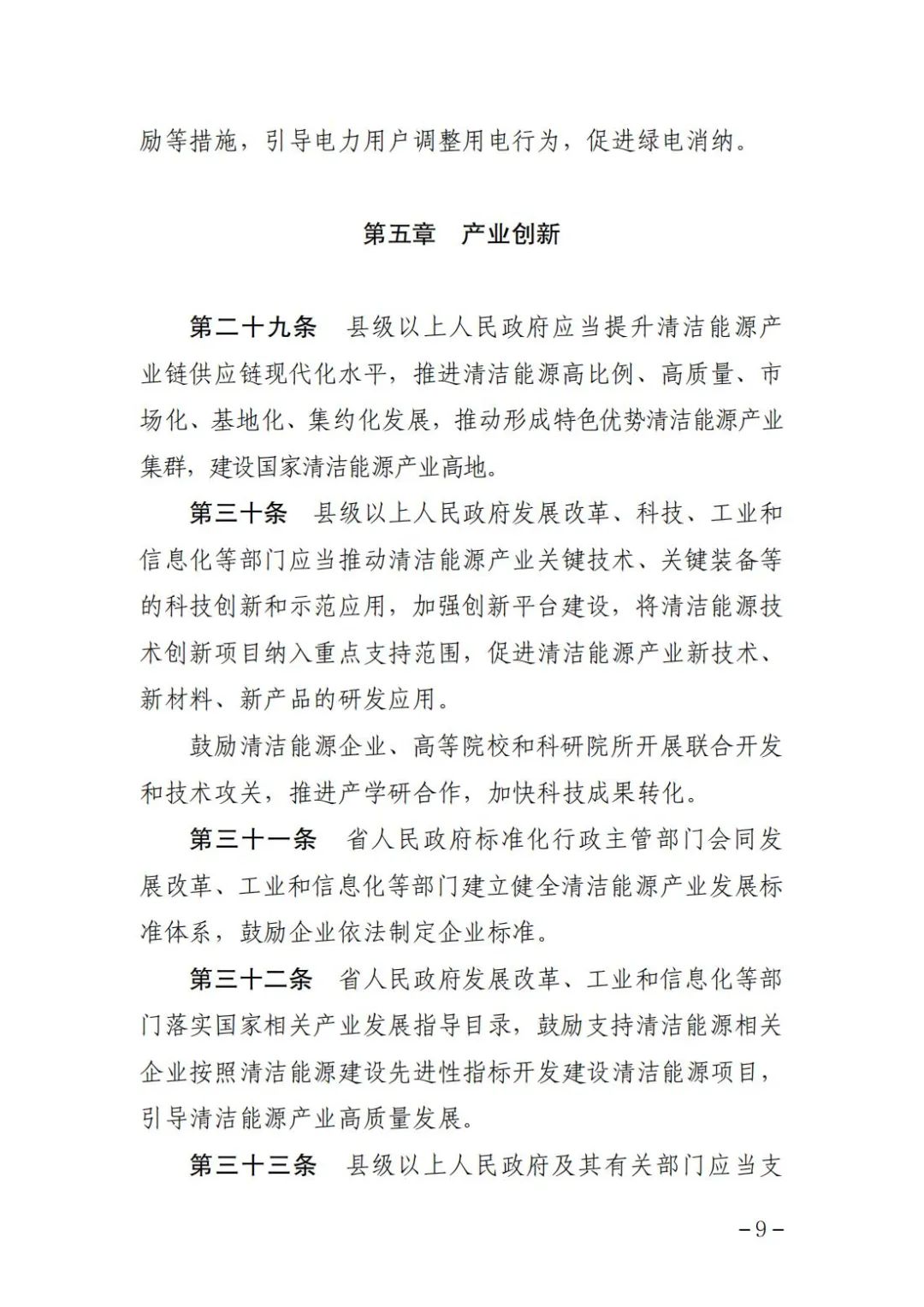 縣級以上人民政府及其有關(guān)部門應(yīng)當(dāng)支持清潔能源產(chǎn)業(yè)鏈協(xié)同發(fā)展,推進(jìn)電源、電網(wǎng)、負(fù)荷、儲(chǔ)能、風(fēng)光制氫一體化等項(xiàng)目建設(shè),探索綠電直供模式創(chuàng)新,推進(jìn)清潔能源產(chǎn)業(yè)集群化發(fā)展,壯大以清潔能源發(fā)電成套裝備、關(guān)聯(lián)設(shè)備制造為主體的產(chǎn)業(yè)鏈。