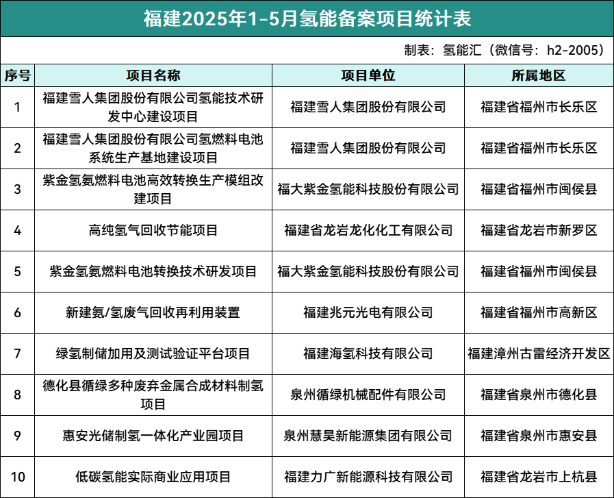 福建氫能備案項目10個。