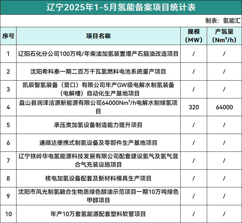 遼寧氫能備案項目10個,規模總計320MW,產氫量總計64000Nm3/h;