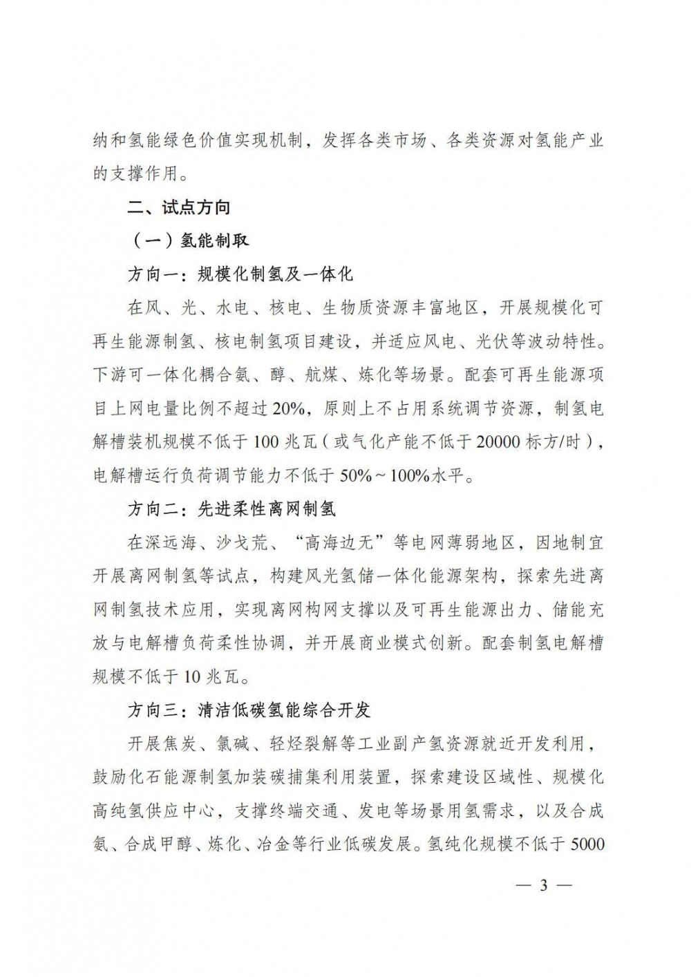 文件指出,氫能試點包括項目試點和區域試點,試點方向包括規模化制氫及一體化,先進柔性離網制氫,清潔低碳氫能綜合開發,規模化、長距離輸送,高密度、多元化儲存,煉油及煤制油氣綠色替代,氫氨燃料供電供能,氫儲能長時長效運行,能源領域綜合應用,氫能實證實驗平臺和氫能低碳轉型試點。